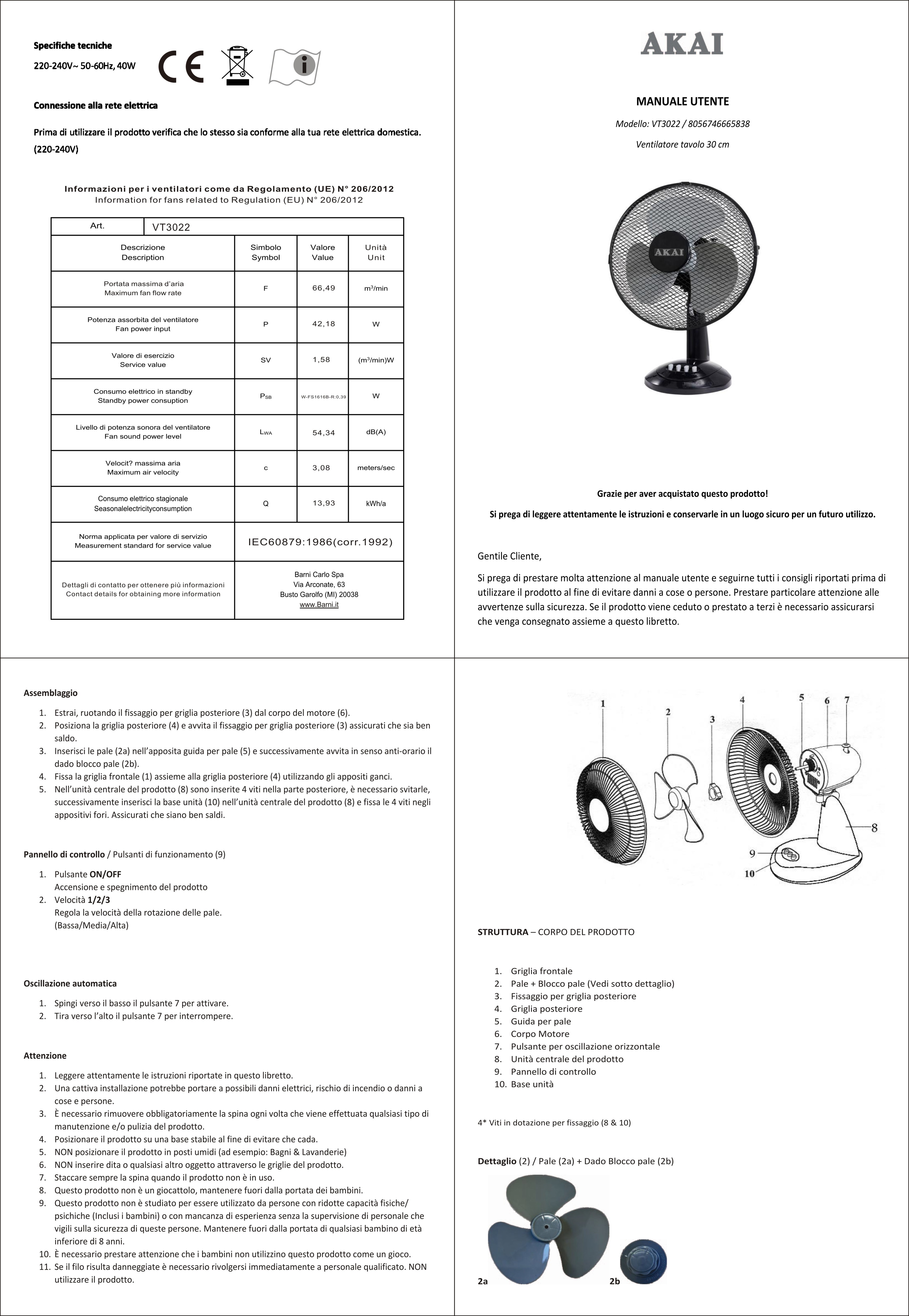 | Altre caratteristiche | Oscillazione DX/SX - Inclinazione Alto/Basso regolabile manualmente - Griglia a nido d’ape - Maniglia posteriore per trasporto - Unità principale in plastica |